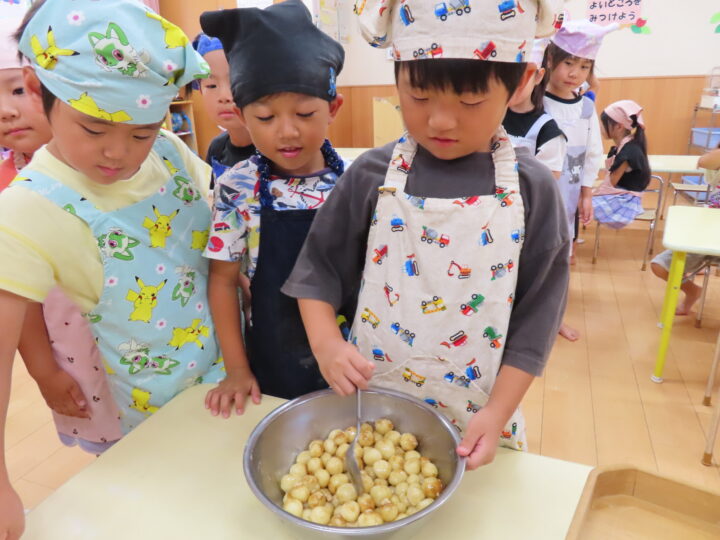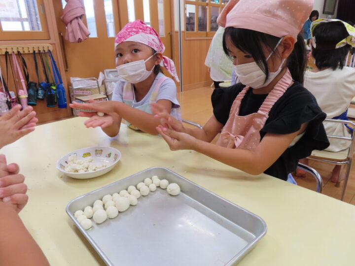 5歳児さんは「お月見団子作り」に挑戦!一つ一つかわいい手で一生懸命丸め、かわいい団子の完成!