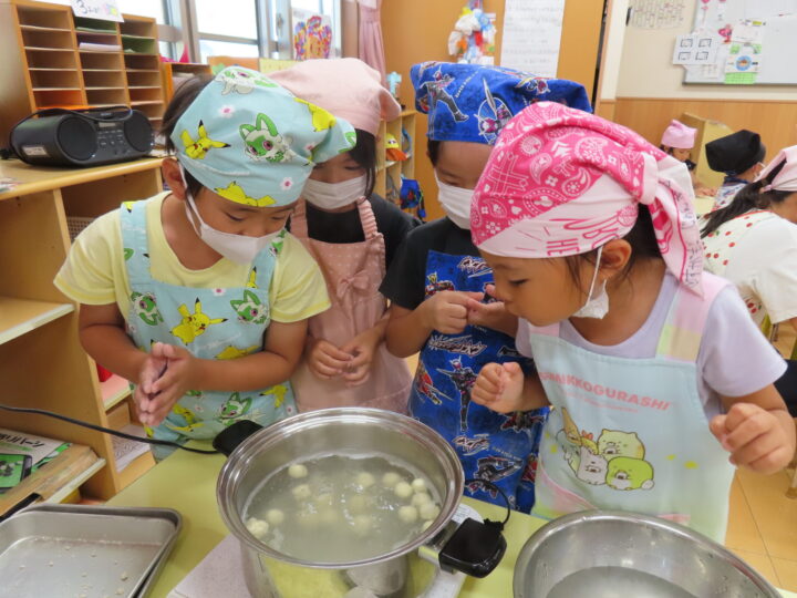「あ!浮かんできた!すごい!!」「え?色も変わってない?!」と団子の変化にも気づく子どもたち!
