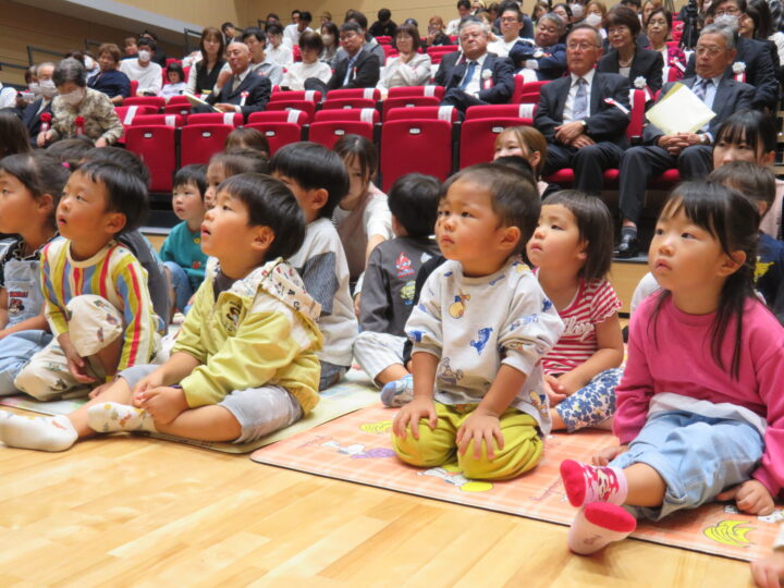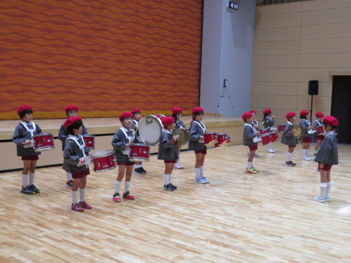 年長らいおんぐみによる鼓隊演奏を披露しました。運動会で大勢の方の前で演奏したことが自信に繋がったのか式典当日も更に堂々と立派にできました。