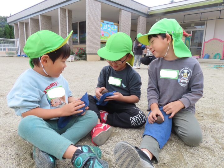 この青いタオルで優しくこすると、ピカピカ黒く光る事を教えてもらい、お友だちと変化を楽しんでいます😆