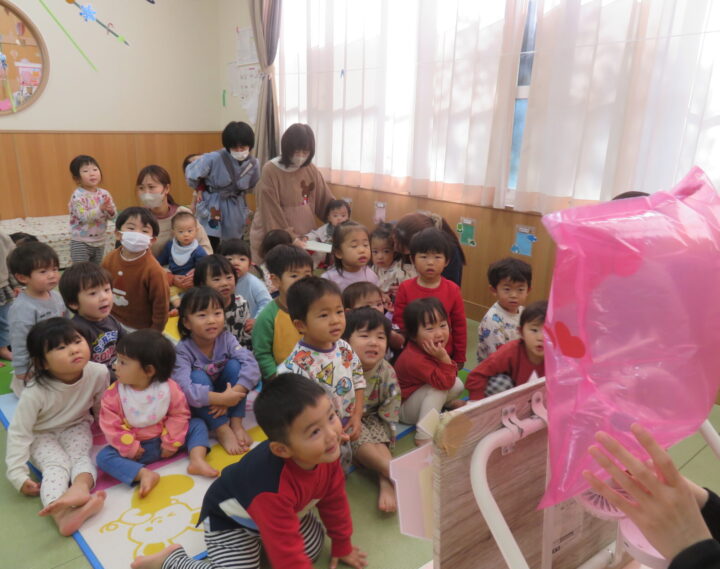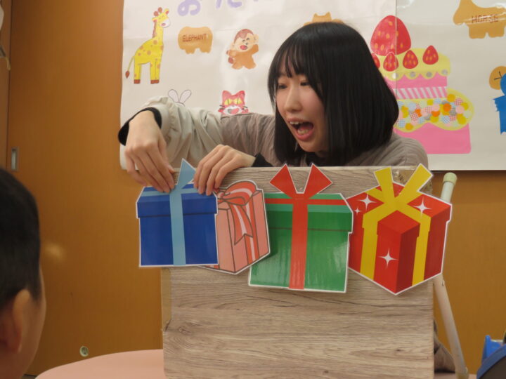 先生の出し物は、カラフルなプレゼントの箱から、いろんなキャラクターが登場!最後は美味しそうなケーキが出てきて嬉しそうな子どもたちでした♪