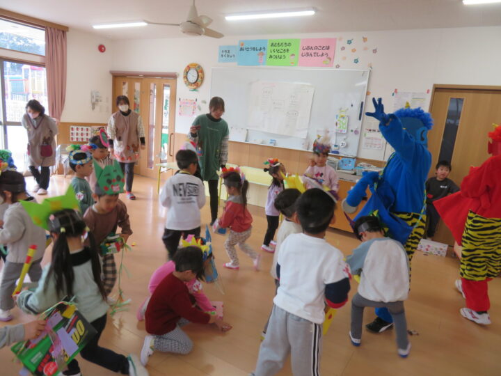以上児クラスは、わくわくタイム(異年齢交流)で鬼を退治しようと準備してきました!