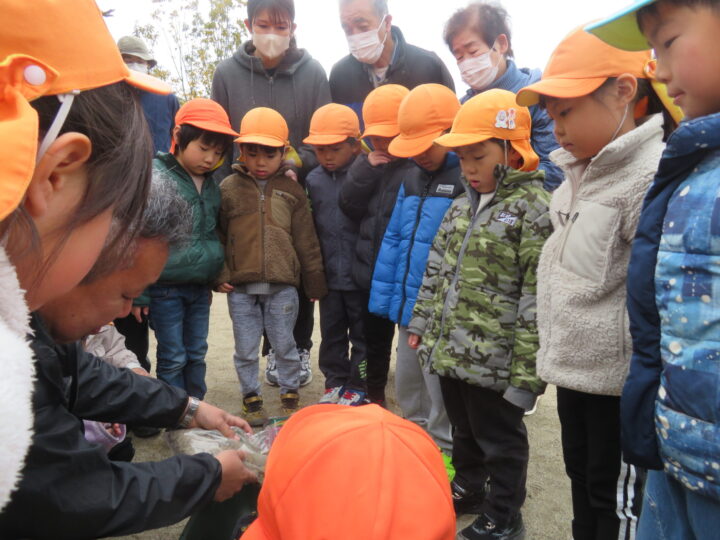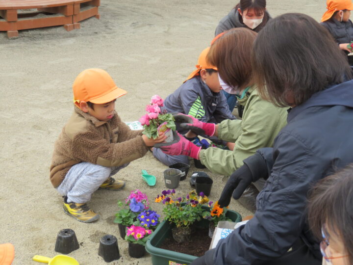 2月10日『大分園芸鉢もの植木組合』の方々が9名来園され、らいおんぐみさん(年長)に花に親しんで貰いたいと指導して頂きながら寄せ植えの体験をさせて頂きました